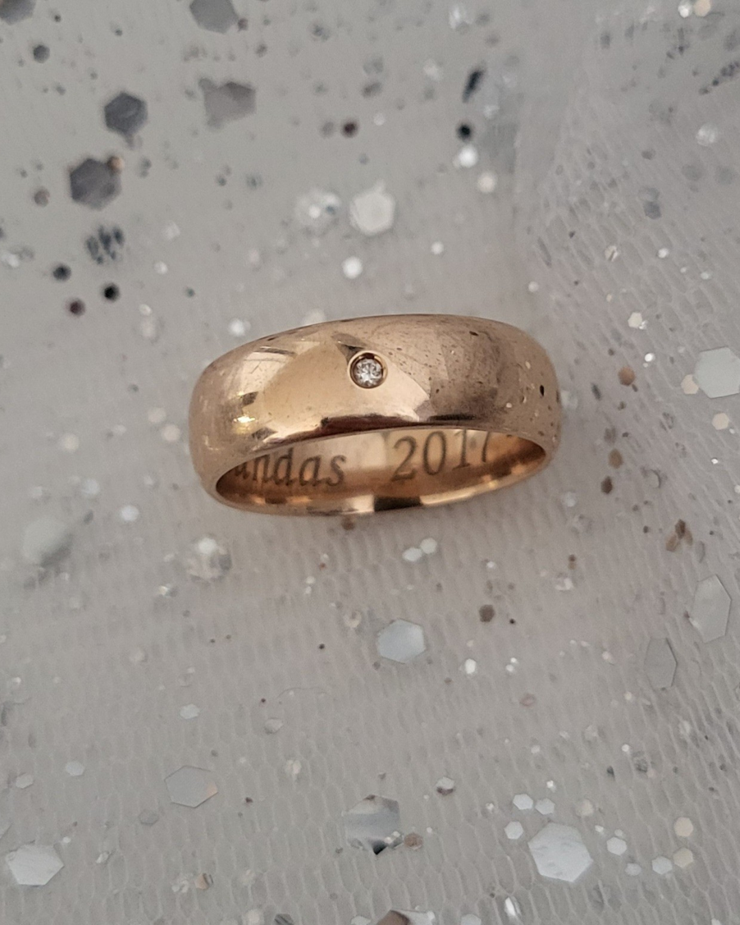 Iš klasikinio geltono aukso sukurtas žiedas, dekoruotas subtiliu deimantu ir personalizuota graviruote vidinėje pusėje. Tai išskirtinis dirbinys, turintis emocinę vertę. Tinka kaip vestuvinis žiedas ar dovana svarbiai progai – kai norisi paprastumo su prasme.